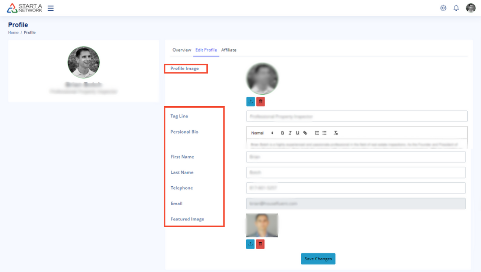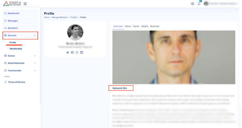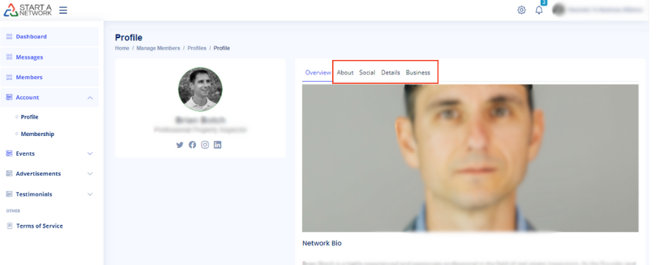 - About: Upload a featured image, define your role, and write a network-specific bio.