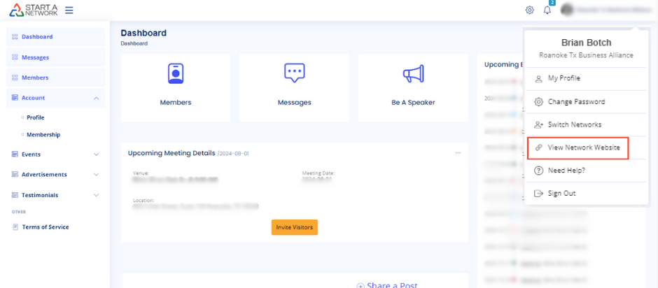- Click your photo in the top right corner and select View Network Website.